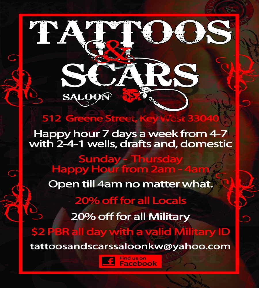 Tattoos and Scars is more than a Key West Bar, it’s a completely dynamic social experience. Our bar attracts many locals and tourists alike. Since we are open so late, many of the local bartenders, servers, and tour guides come here after their shifts to mingle and drink.